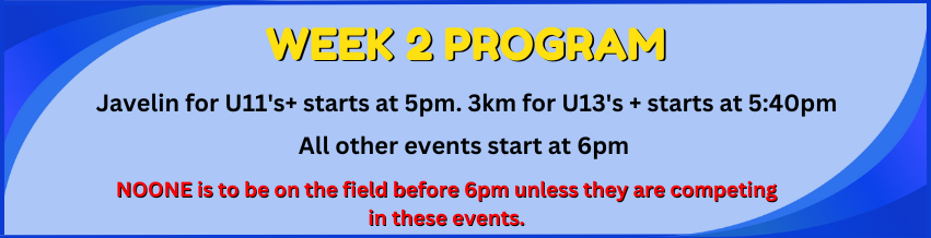 PROGRAM 2 (WEEK 2): For the U/11s+ we offer Javelin. This will start at 5:15pm, and anyone wishing to compete will need to have their name recorded at the Javelin sector.